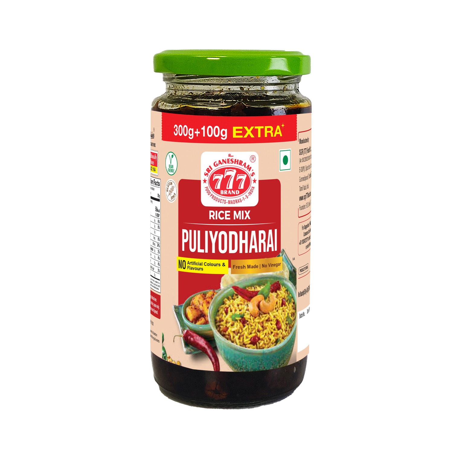777’s puliyodharai paste, and with a spoonful of flavor-packed puliyodharai ready mix makes plain rice into a soul-satisfying South Indian classic. It is famous for its perfect blend of tamarind and flavorful spices. Puliyodharai paste paste is a staple in every pantry for those who relish homemade regional food. This paste is an any-time use from hectic workdays to celebratory feasts.